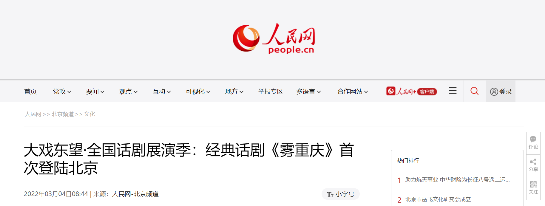 人民網(wǎng)——大戲東望·全國(guó)話劇展演季:經(jīng)典話劇《霧重慶》首次登陸北京