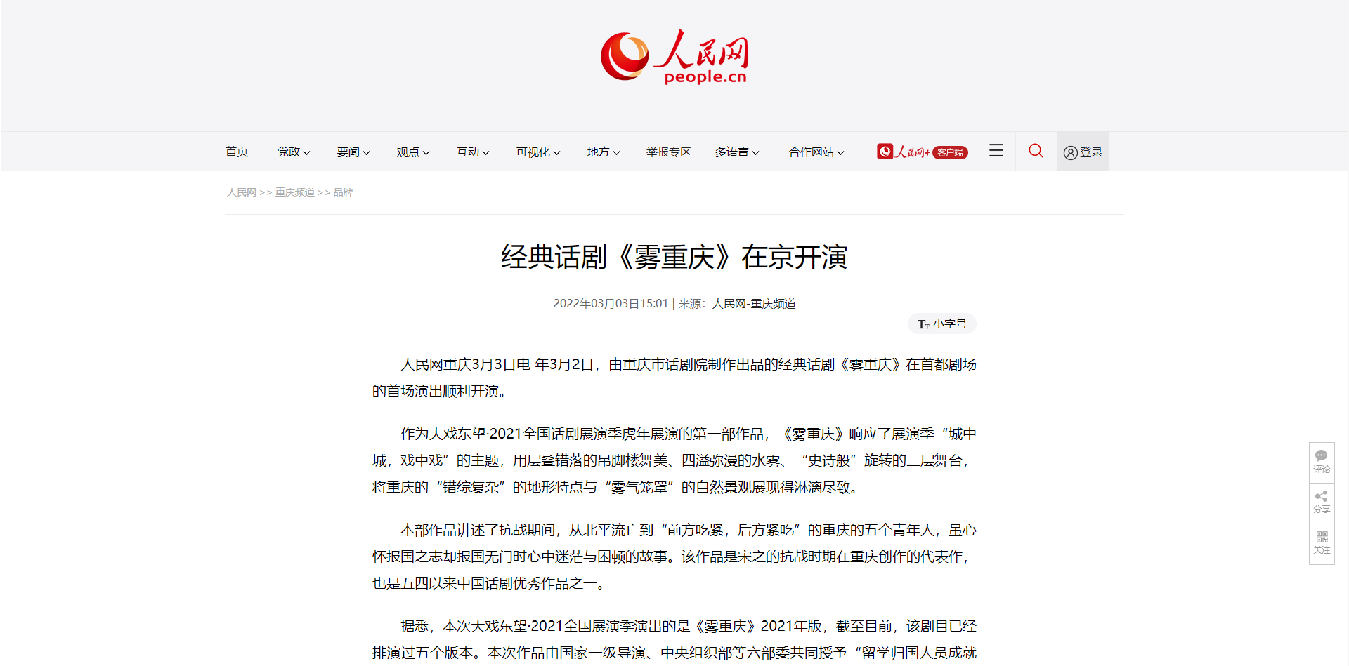 經(jīng)典話劇《霧重慶》在京開演2022年03月03日15:01 | 來源:人民網(wǎng)-重慶頻道 人民網(wǎng)重慶3月3日電 年3月2日,由重慶市話劇院制作出品的